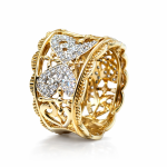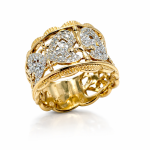 Estate 14K yellow gold wide heart band set with 78 round diamonds totaling 0.50ctw. Tapered comfort fit design measuring 11mm to 18.5mm with a bold 18.7mm base. Size 9, 9.44g. A substantial vintage statement ring with brilliant sparkle.